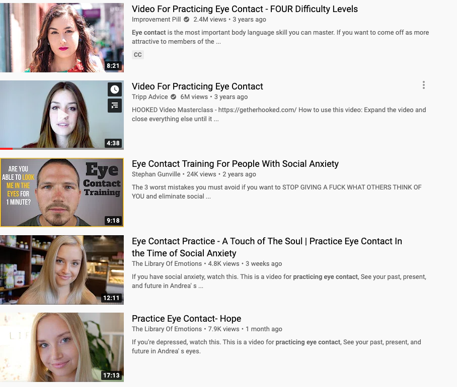 - There are dozens of YouTube videos of people staring into the camera intended to help viewers practice eye contact. Like this one.