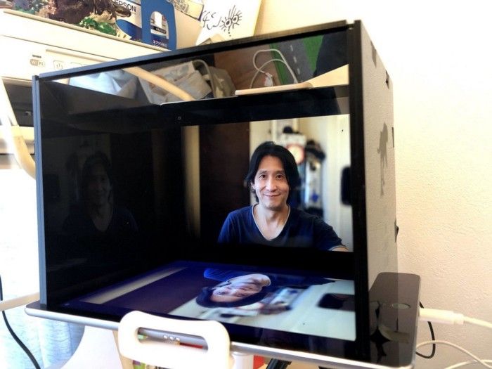 Many people have constructed teleprompter-like boxes to correct for camera placement. These techniques seem cumbersome and also might make it difficult to collaborate on shared documents or engage in meetings with more than 2 participants.
