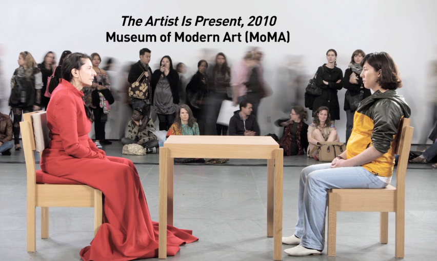 - In 2010, artist Marina Abramović created a performance at MoMA, The Artist is Present. She sat in the middle of a gallery during opening hours and invited museum visitors to line up and gaze into her eyes.