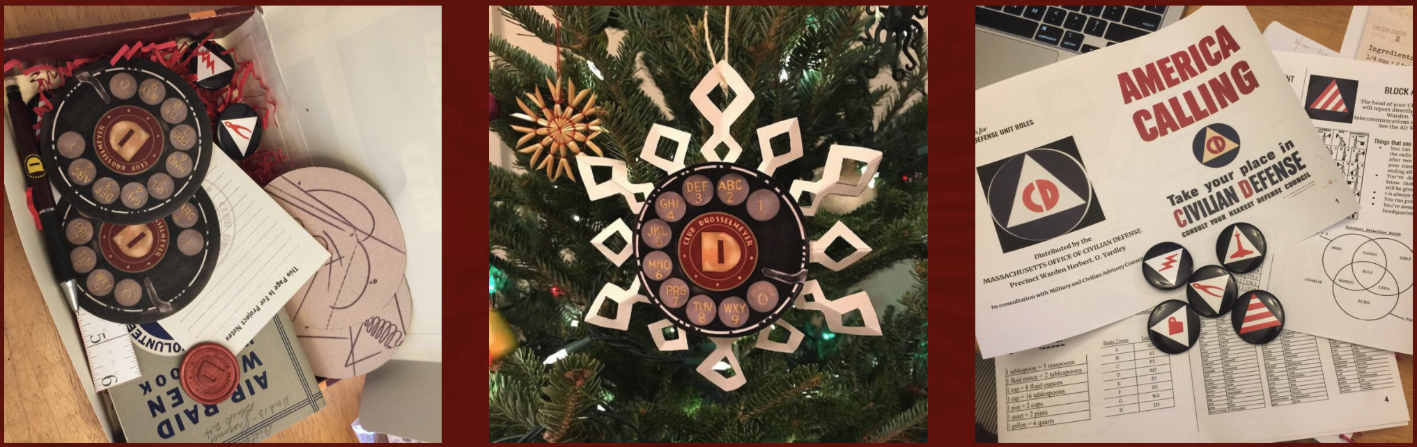 This year I really wanted people to win the game by being collaborative rather than competitive. So, we're in 1943 and the Civil Defense Corps were the neighborhood watch team that would get together and prepare in case we were bombed. I have this wonderful board and handbook from the era. We pored through the whole thing to find everybody's civilian logos. There's an emergency food and beverage person, the bomb reconnaissance person, or utility repair person. They all have their logos, and they'll have the things that they're supposed to do. We created puzzles where you needed information from all of these different people in order to complete it. Everybody will have different roles.